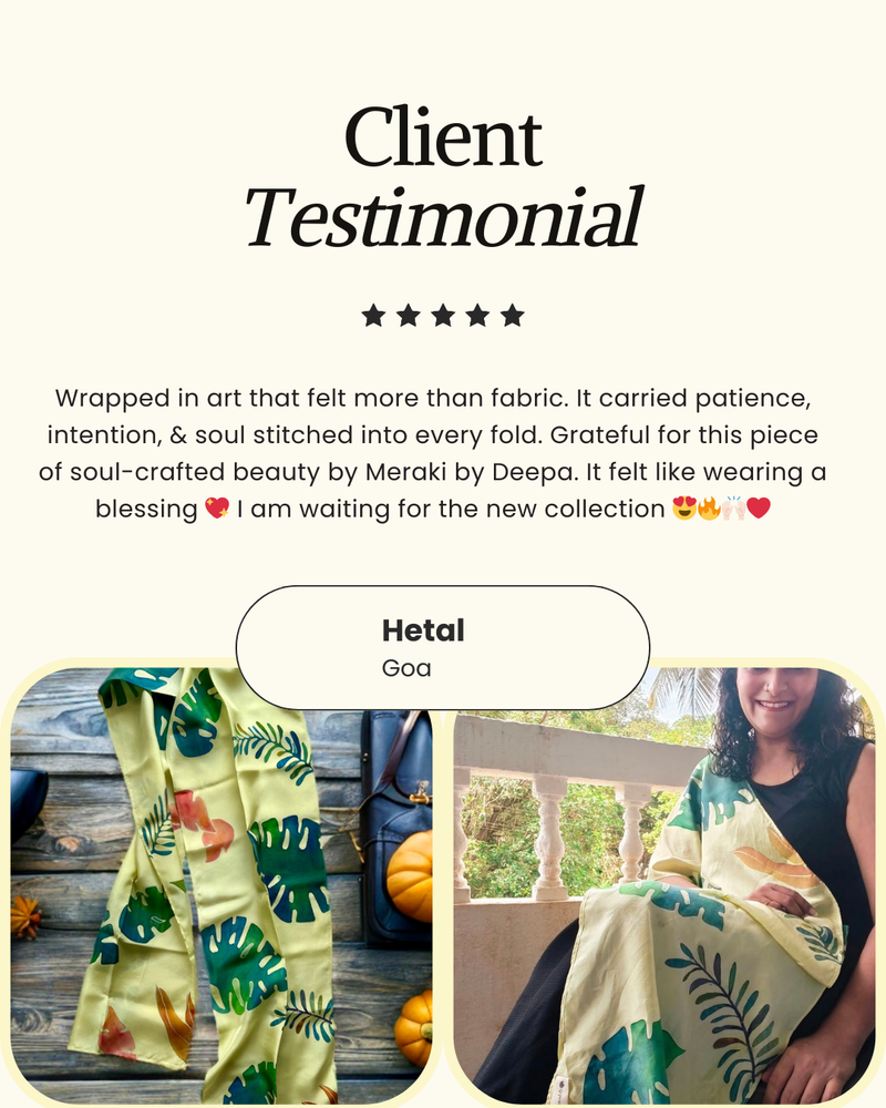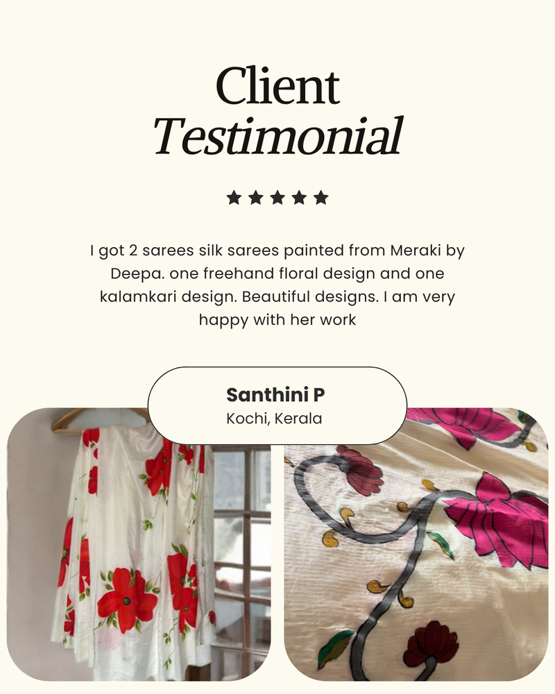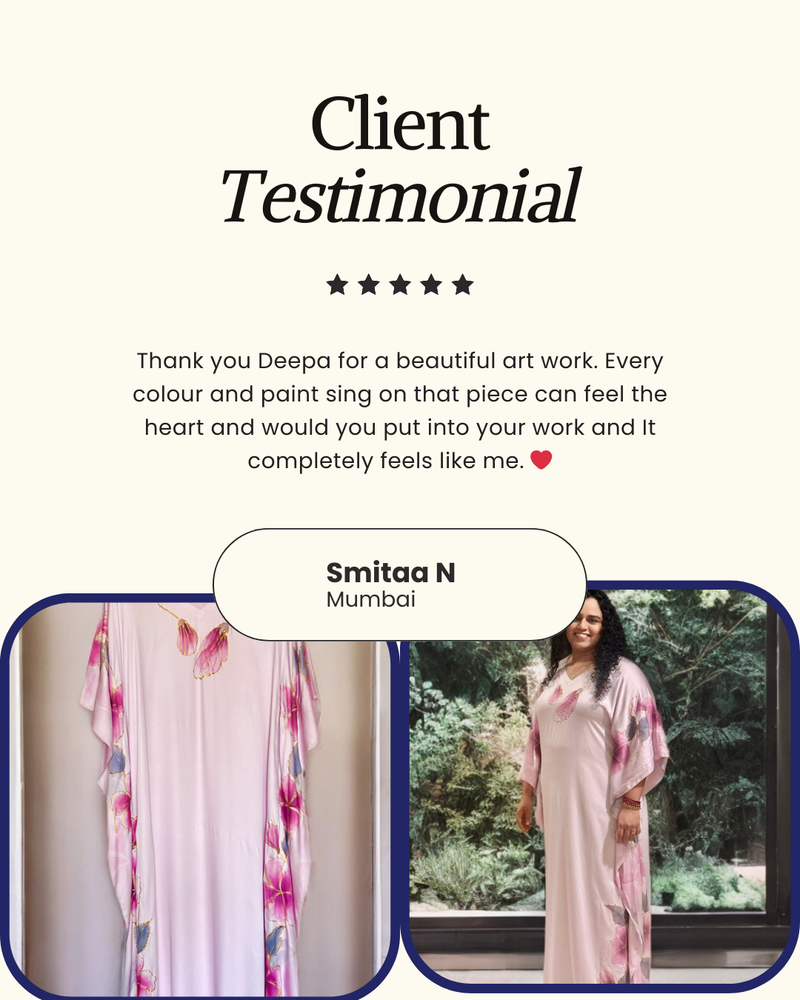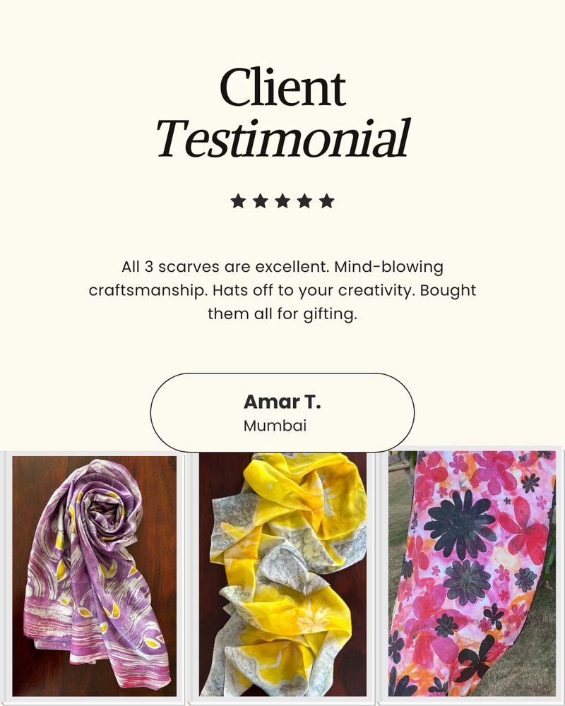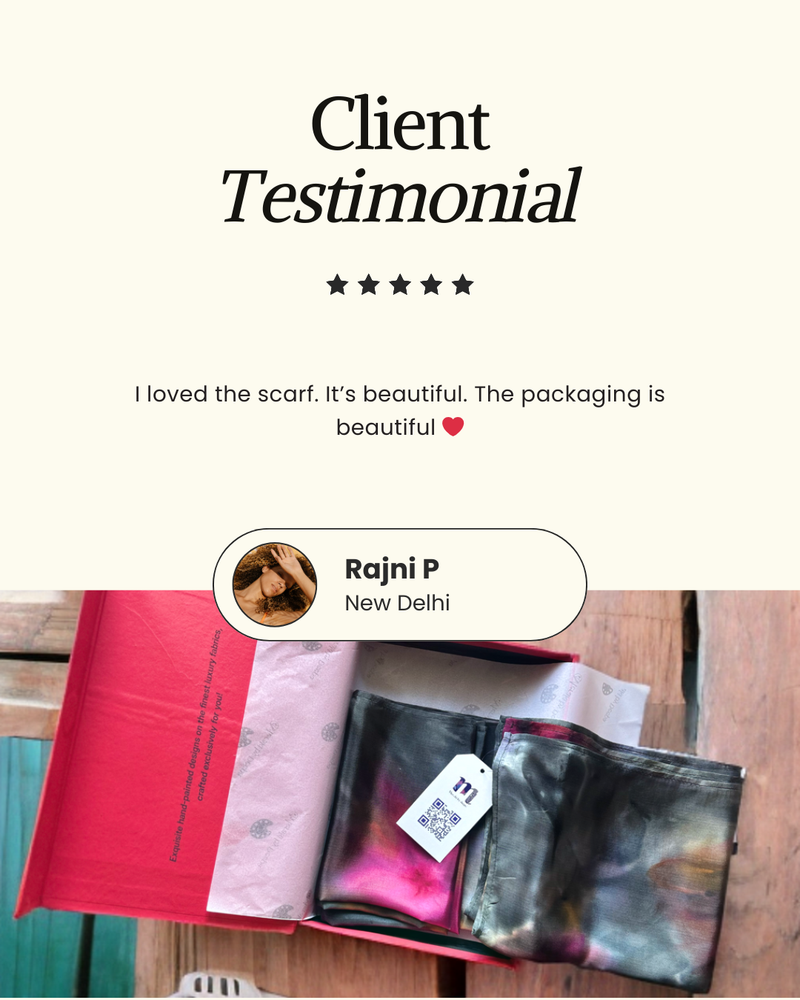 Her signature style is all about fearless creativity; her love for unconventional colour palettes and abstract strokes result in striking, one-of-a-kind hand painted silk pieces. With an insatiable drive to innovate, she thrives on pushing creative boundaries by constantly seeking new styles and techniques; ensuring each creation is as fresh and unique as the last.
