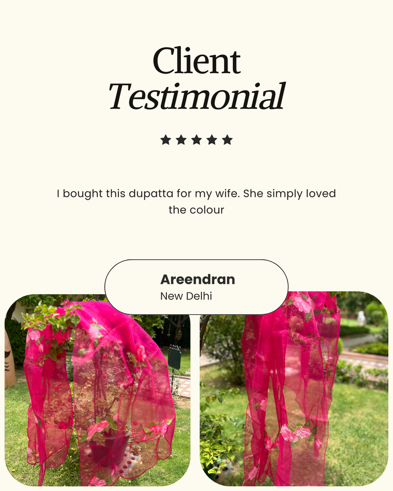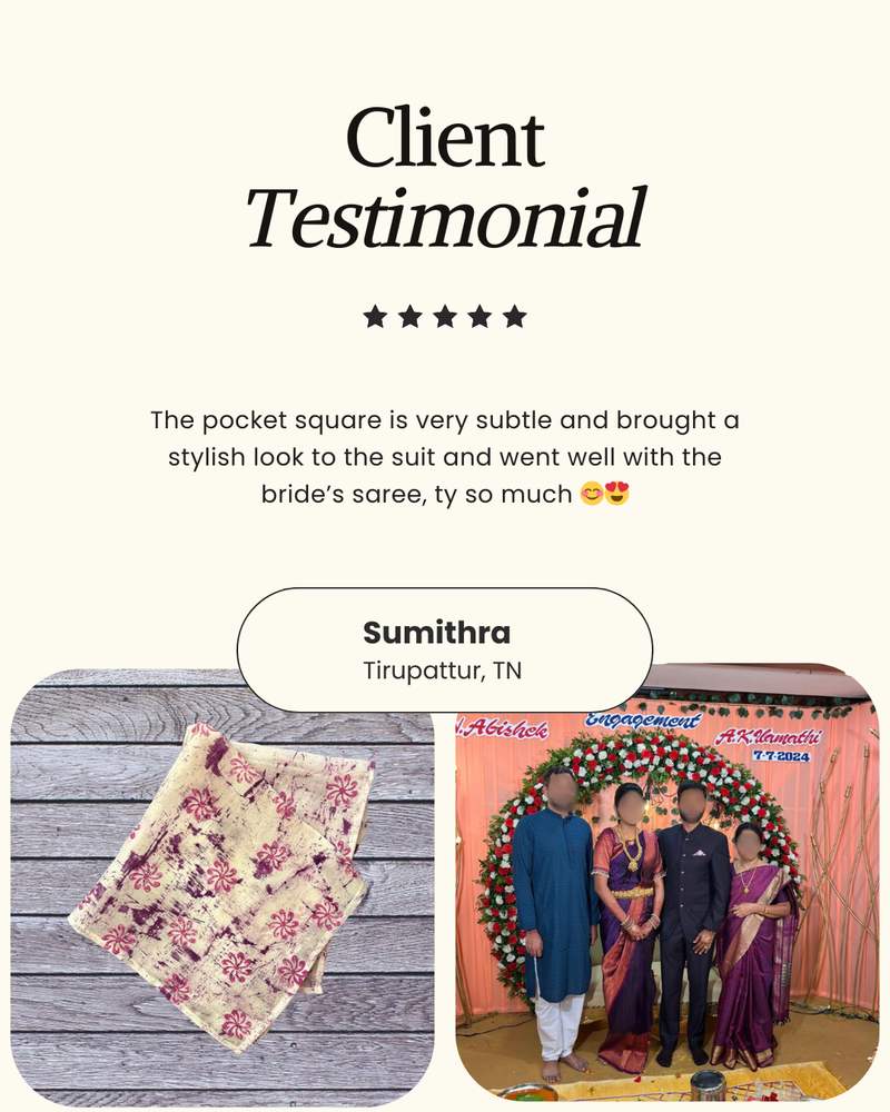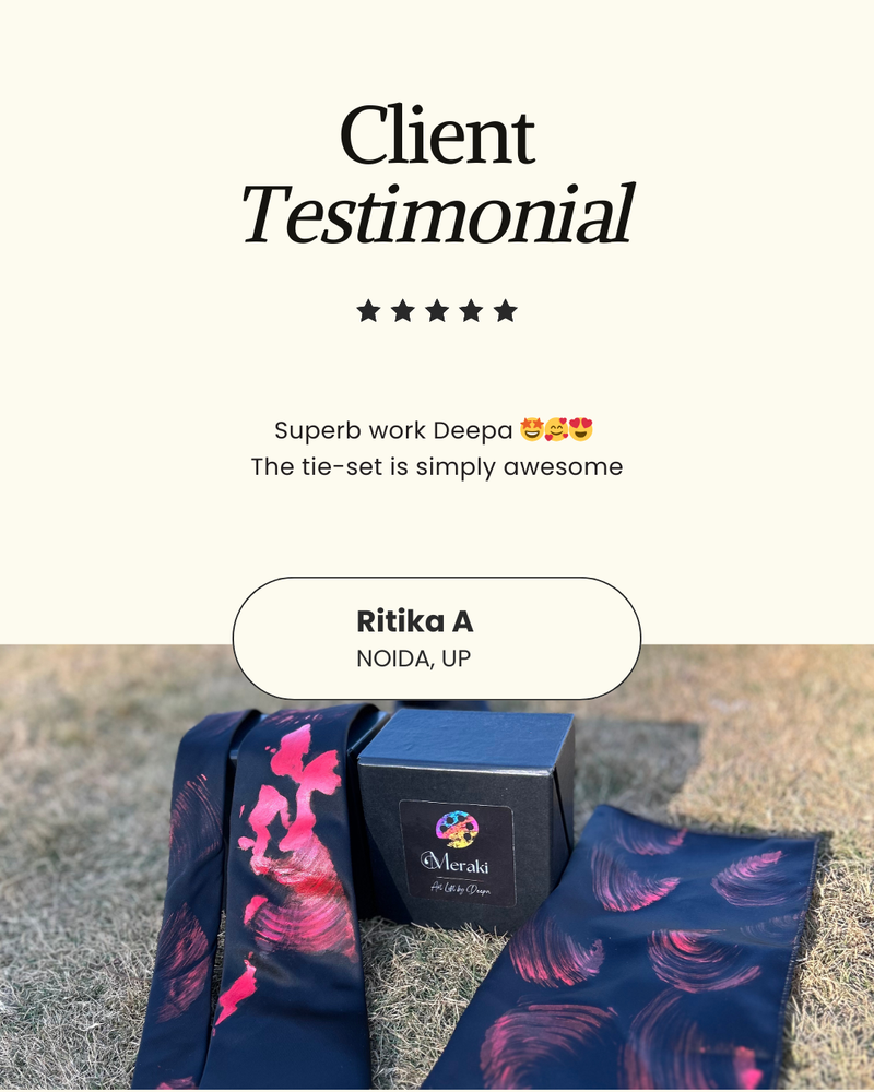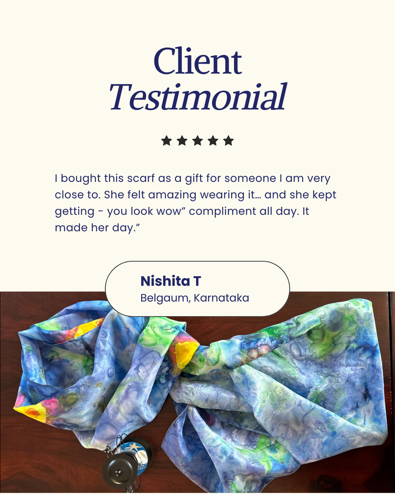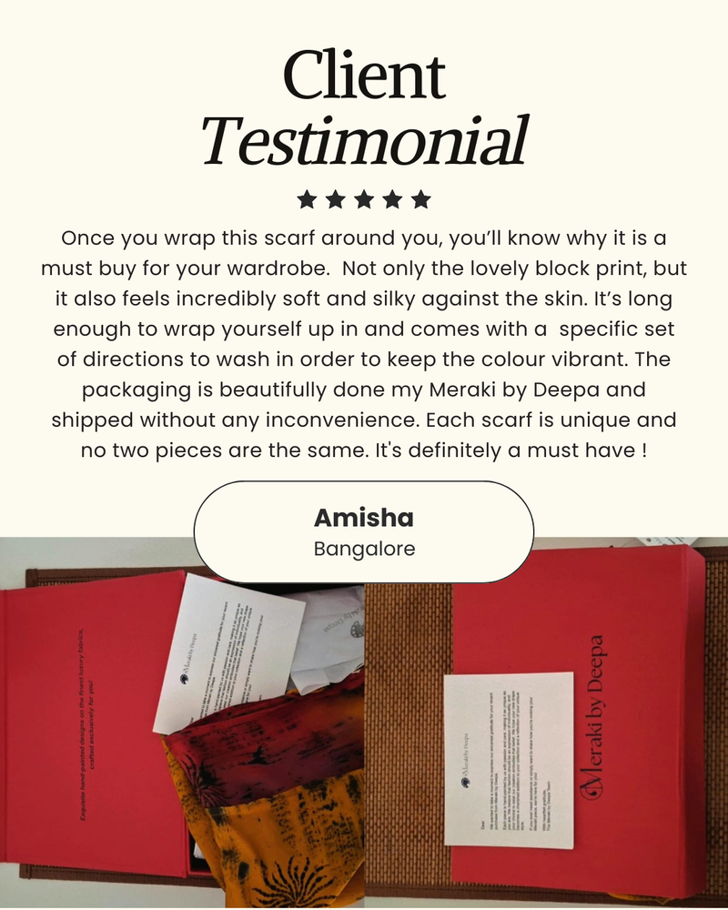 Her signature style is all about fearless creativity; her love for unconventional colour palettes and abstract strokes result in striking, one-of-a-kind hand painted silk pieces. With an insatiable drive to innovate, she thrives on pushing creative boundaries by constantly seeking new styles and techniques; ensuring each creation is as fresh and unique as the last.