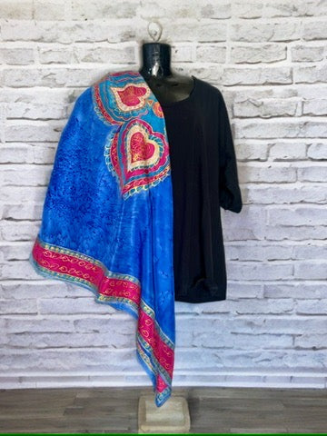 A masterpiece of elegance and intricate detailing, this large silk scarf is adorned with delicate gold outlines, framing an exquisite design. At its centre lie four heart-shaped pink booties, symbolizing grace and charm, enveloped in intricate nakshi-style detailing, adding depth and artistry. The contrast of a soft blue base with a vibrant pink border, adorned with golden leaves across all four sides, creates a striking yet harmonious aesthetic.