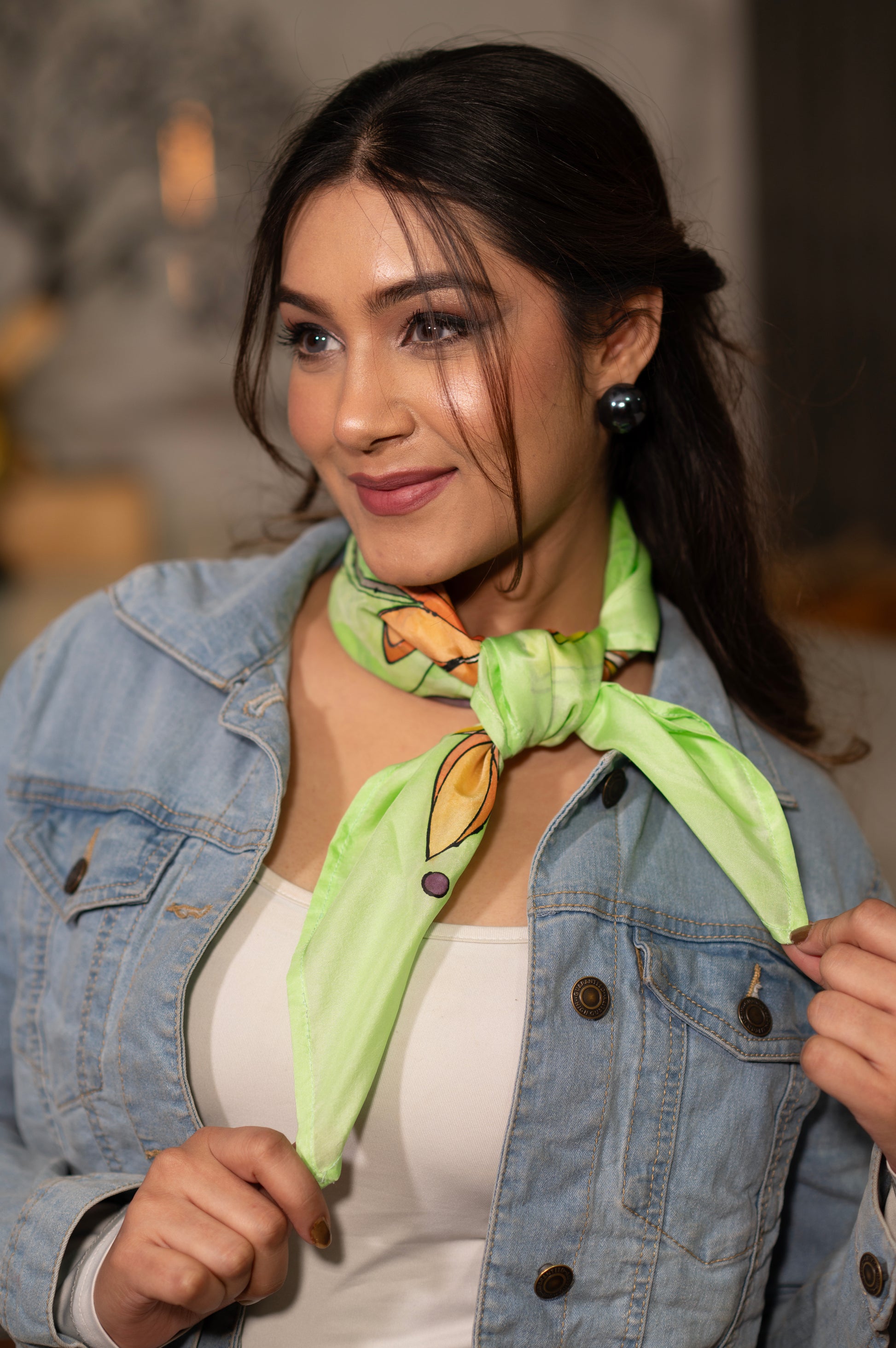 For those who love bold motifs and wear them with confidence, this scarf is for you! This pastel green mini silk scarf is a radiant expression of strength and grace. Adorned with handpainted sunflowers in vibrant yellow and soft peach tones, the design bursts with energy, while delicate vine stems weave across the silk, adding movement and depth.