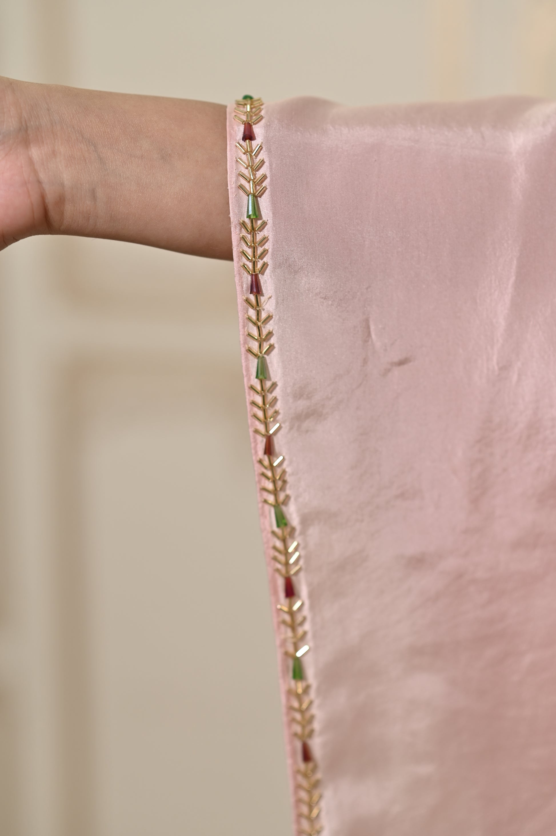 The delicate handwork on the neckline, adorned with a striking pendant motif, adds a beautiful touch, while the intricate matching karigari on the sleeve borders enhances its regal charm. The soft peach hue exudes femininity and warmth, making it the perfect ensemble for soirées, social gatherings, or evening and day celebrations alike.