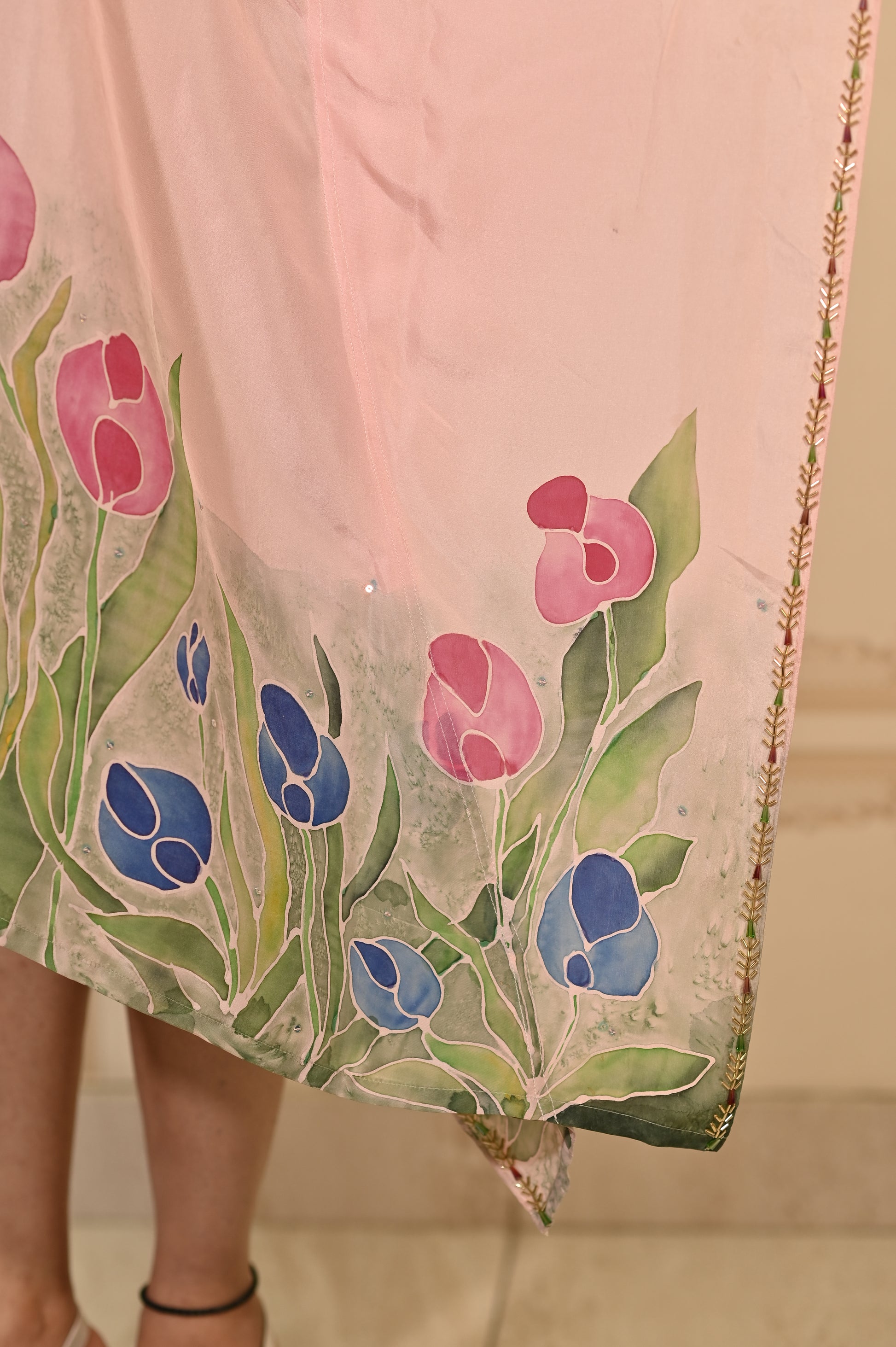 Drift into a dream of sheer luxury with this exquisite silk peach kaftan with handpainted tulips. Crafted from the finest silk, its feather-light drape caresses the skin like a whisper, making every movement feel like poetry in motion.